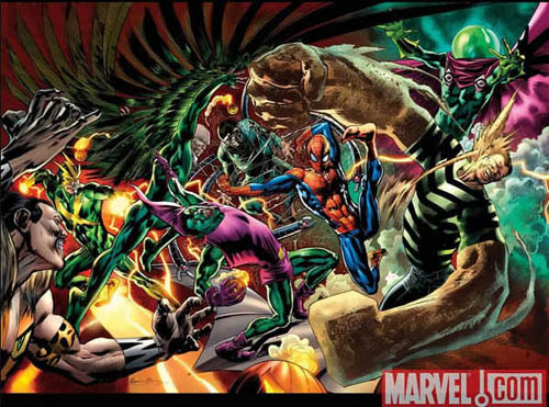 O roteiro é de Dan Slott e a arte de Stefano Caselli, as imagens que estão sendo apresentadas mostram um belo estrago feito pelo sexteto de vilões e o nosso amigo de sempre na vizinhança se preparando para entrar na luta.