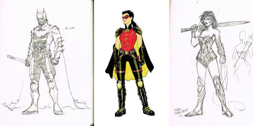 O novo design do Batman e da Mulher Maravilha são de Jim Lee e o desenho da Robin é de Kevin Maguire.