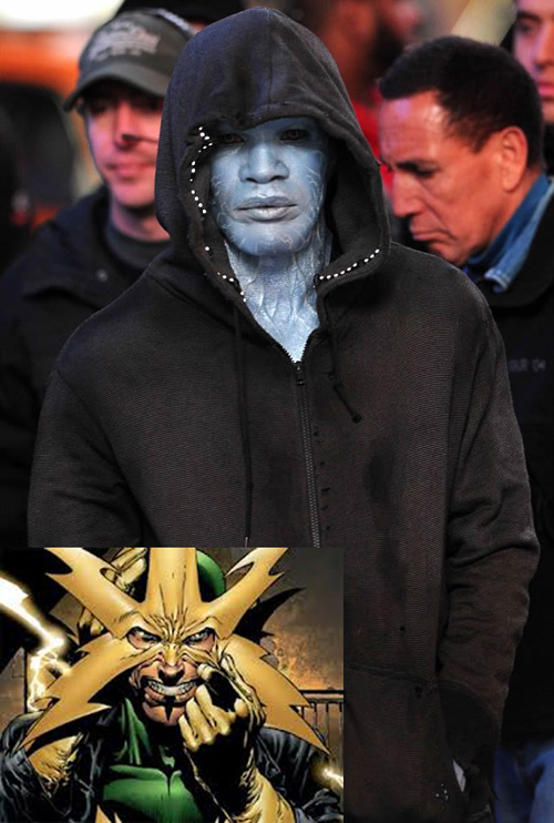 Está circulando na web a primeira imagem do ator Jamie Foxx como Electro, devo confessar que ele está parecendo um homem de gelo. Não sei se curti muito... Inserimos na foto uma imagem do Electro dos quadrinhos para que vocês possam comparar.