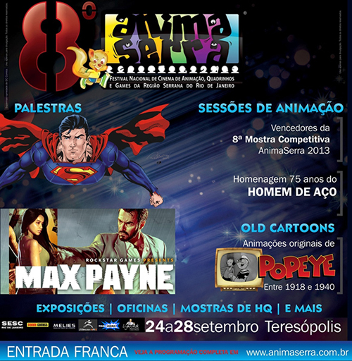 No período de 24 a 28 de setembro acontecerá o 8º Animaserra ? Festival Nacional de Cinema de Animação, Quadrinhos e Games da Serra Carioca no SESC Teresópolis com entrada franca e ainda será organizado um concurso de HQ.
