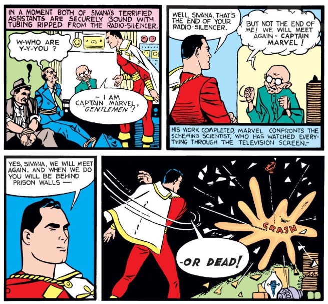 He tried to extort $50,000,000, only to be stopped by Captain Marvel in his first adventure. Cap broke through the window of the building where Sivana was hiding and defeated the guards, binding them securely with tubing ripped from the radio-silencer. Sivana planned to kill Captain Marvel with a blast from his Atom-Smasher, but Cap leaped back out the window and escaped. During the fight, Sivana's returning army angrily asked why Captain Marvel had defeated them in their war against America despite their highly advanced weaponry.