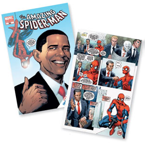 Um vilão usurpa a identidade de Barack Obama para tomar posse na Presidência no lugar dele. Só mesmo o Homem-Aranha para salvar a América desse complô maligno. Esse é o roteiro da edição 583 de The amazing Spider-Man, revista em quadrinhos da Marvel. Na capa, Obama sorri diante da sugestão de estampar o rosto do super-herói em uma nota de dólar. Segundo o editor da revista, Joe Quesada, a ideia surgiu quando Obama declarou ser fã do Homem-Aranha. Ele não é o primeiro presidente americano a aparecer nos quadrinhos. Em 1963, John Kennedy ?ajudou? o Super-Homem a proteger sua identidade secreta. A revista chegou às bancas na semana seguinte ao assassinato de Kennedy.